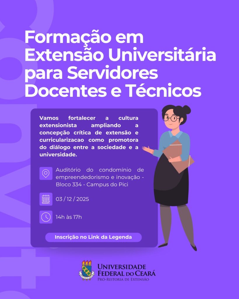 Data da publicação: 25 de novembro de 2025 Categoria: NotíciasA Coordenadoria de Formação e Curricularização da Extensão (Formace) e a Coordenadoria de Ações Curriculares de Extensão (CACE) tem a satisfação de convidá-la(o) para participar da atividade “Formação em Extensão Universitária para Servidores Docentes e Técnicos”, que tem como objetivo fortalecer a cultura extensionista ampliando a concepção crítica de extensão e curricularização como promotora do diálogo entre a sociedade e a universidade. Durante o encontro, serão abordados temas como conceitos e diretrizes da extensão, sua integração ao ensino e à pesquisa, as políticas internas de extensão, os regulamentos institucionais (resoluções, fluxos, atribuições), no contexto da curricularização da extensão, o papel social da universidade e a contribuição de docentes, técnicos e discentes. Será uma oportunidade enriquecedora para ampliar conhecimentos, compartilhar experiências e fortalecer ações comprometidas com a transformação social. Faça a sua inscrição!