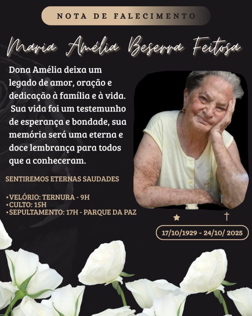 A Faculdade de Economia, Administração, Atuária e Contabilidade informa e expressa seu sentimento de pesar pelo falecimento, na data de hoje, da senhora Maria Amélia Bezerra Feitosa, mãe da Professora Marilene Feitosa Soares, do Departamento de Contabilidade.