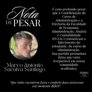 É com profundo pesar que a Coordenação do Curso de Administração e a Diretoria da Faculdade de Economia, Administração, Atuária e Contabilidade (FEAAC) comunicam o falecimento do estudante Marco Antônio Saraiva Santiago, do curso de Administração. Sua partida prematura deixa um vazio irreparável em nossa comunidade acadêmica.